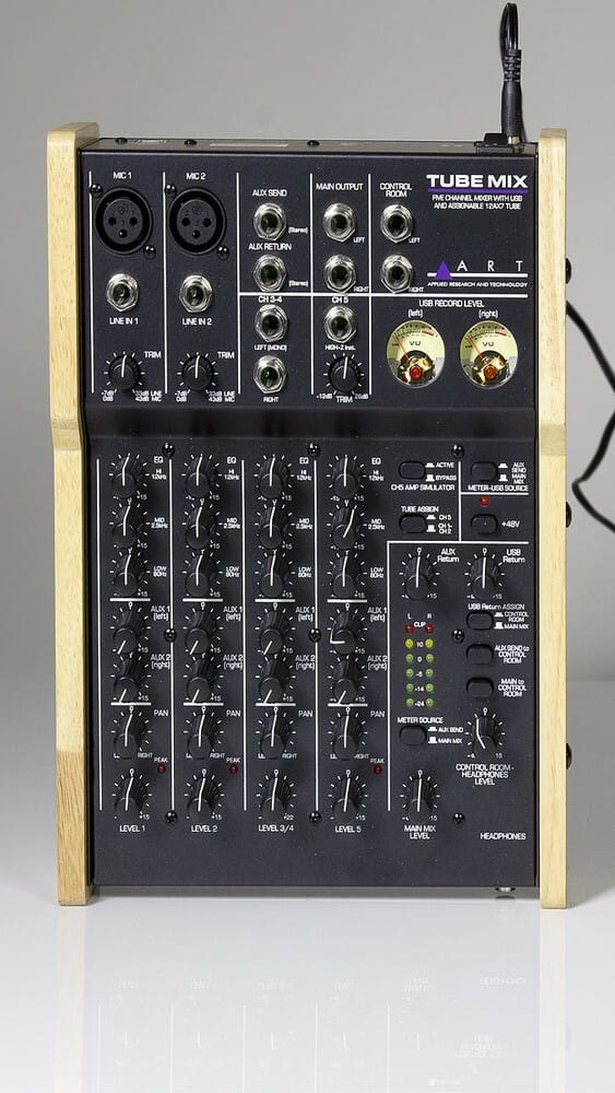 The ART TubeMix stands out in the world of audio mixers by blending vintage aesthetic appeal—complete with wood paneling and VU meters—with modern functionality, making it an attractive and practical choice for both musicians and podcasters. Its standout feature is a genuine 12AX7 tube preamp that adds warm, analog coloration to vocals or instruments, while also offering two mic preamps, phantom power, a dedicated high-Z input, and a built-in USB audio interface for seamless digital recording. Priced accessibly, it delivers professional tube sound and flexible connectivity in a visually distinctive package that appeals to creators seeking character and reliability without complexity.